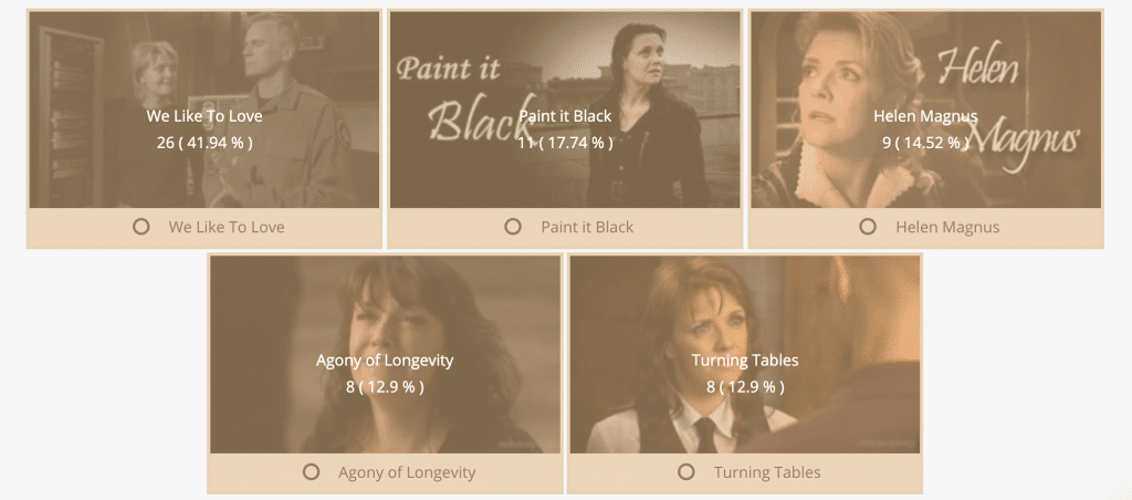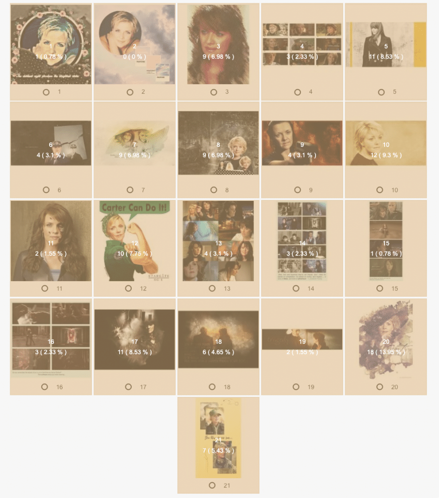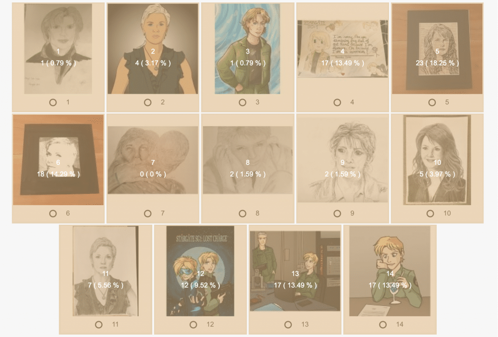 Voting results of the Amanda Tapping Fans Contest 2020. Go to the submissions page to see the big versions of the art and links to the fics and videos.